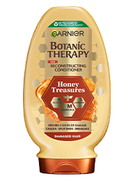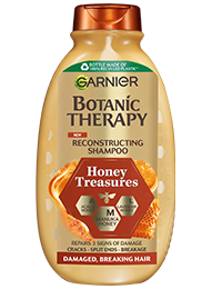 Obnovitvena formula s 3 vrstami medu (akacija, manuka, sivka) deluje na 3 glavne težave poškodovanih las: 2-krat manj razcepljenih konic**, 10-krat manj lomljenja** in 53 % manj razpok v laseh**. Nanesite na mokre lase in sperite. Ne zaužijte. Shranjujte zunaj dosega otrok. V primeru stika z očmi takoj temeljito sperite. * Plastenka je izdelana iz 100-% reciklirane plastike, razen barvil, aditivov in zamaška. ** Instrumentalni preizkusi po uporabi šampona in balzama.