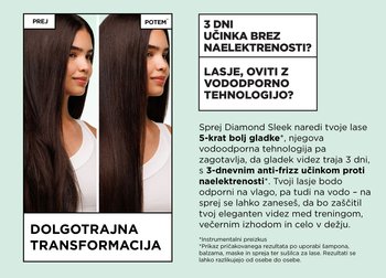 Inovativna formula spreja Diamond Sleek se aktivira s toploto – po pršenju je treba lase posušiti s sušilnikom, da se aktivira sijaj. Za optimalne rezultate priporočamo, da rutino zaključiš z likalnikom za lase. In brez skrbi, sprej bo nudil toplotno zaščito do 230 °C*.