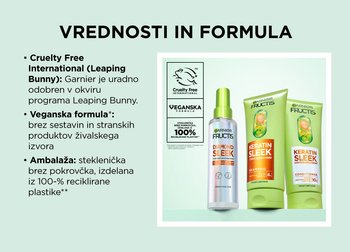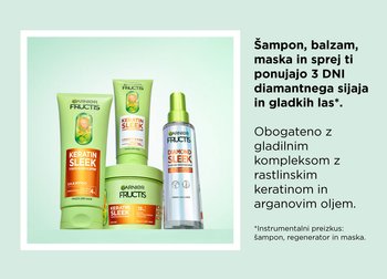 Sprej lahko kombiniraš s svojo najljubšo rutino Fructis, za najbolj briljanten učinek pa preizkusi NOVO linijo FRUCTIS KERATIN SLEEK.